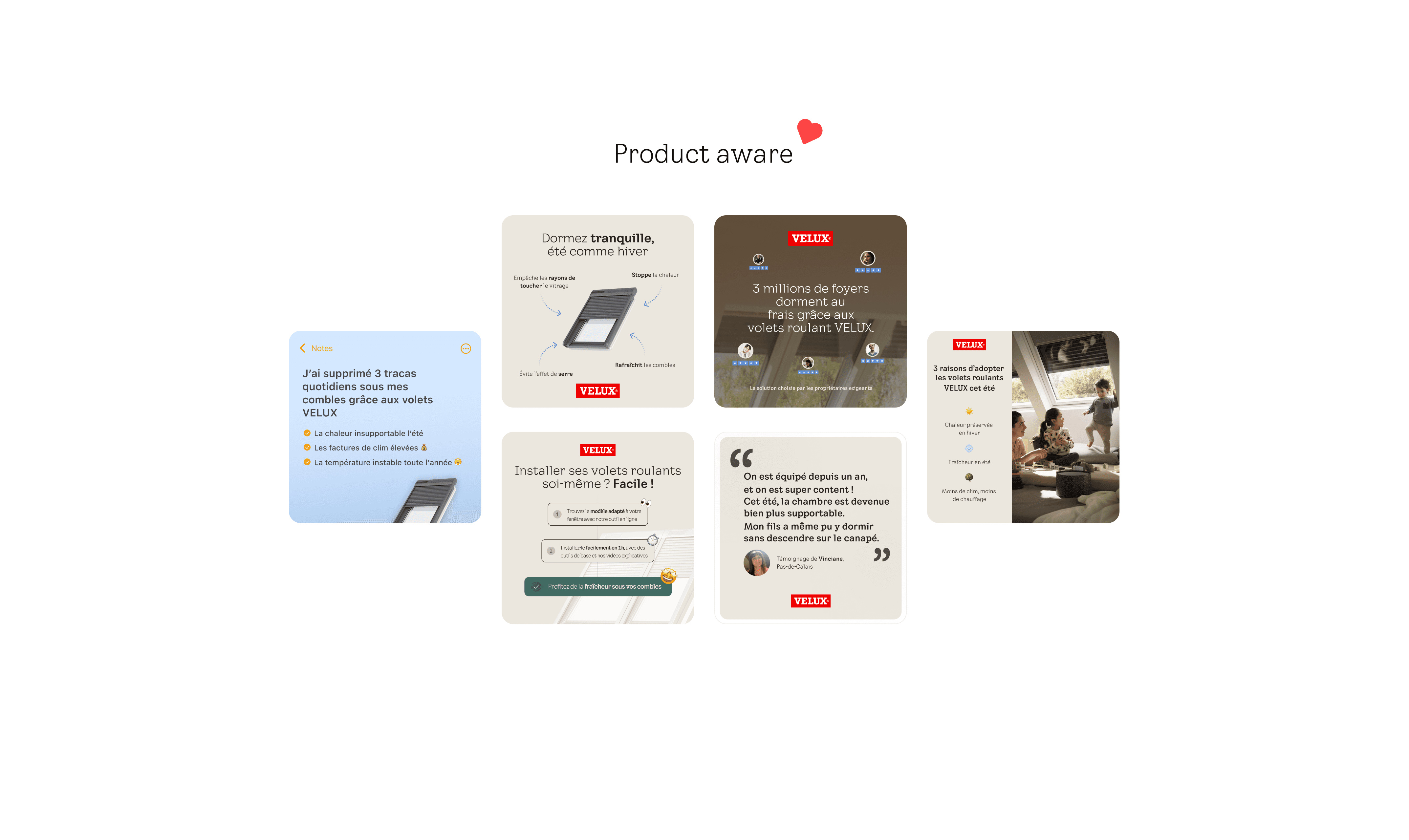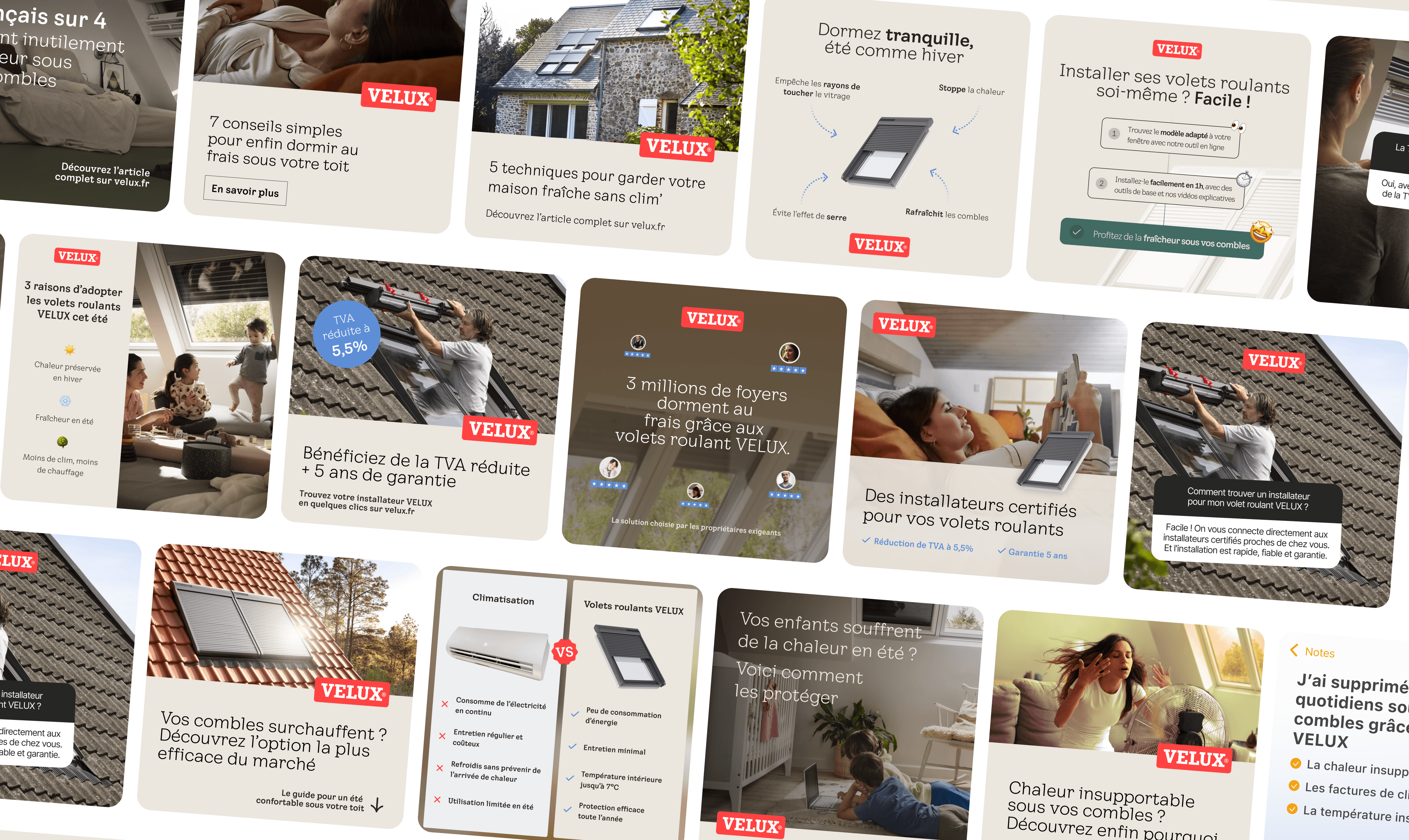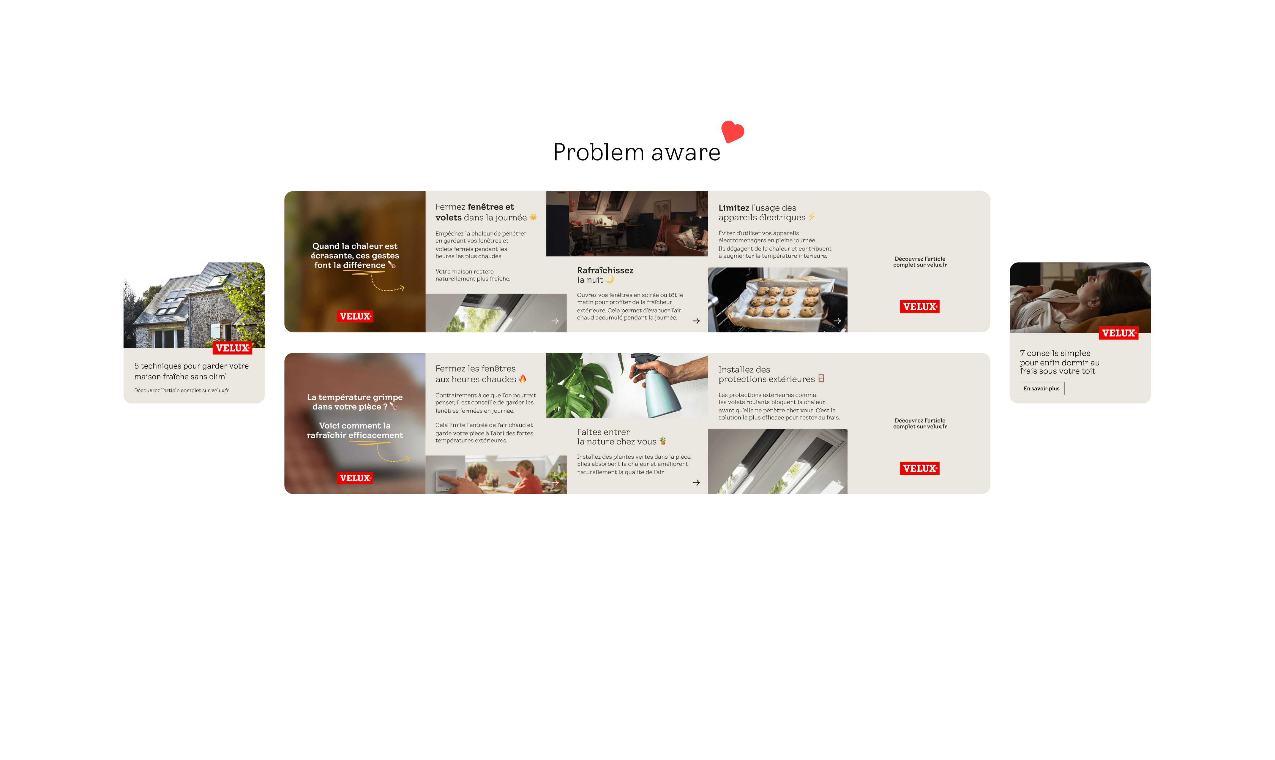 Dans le cadre d’une campagne Velux sur le thème de la chaleur sous les combles, j’ai été contacté pour concevoir une série de posts destinés aux réseaux sociaux, articulés en cinq phases stratégiques : unaware, problem-aware, solution-aware, product-aware et most-aware.